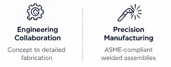 Heavy and large steel structures Large welded modules Structural frames and support modules Ductwork and exhaust gas systems Stack components and structural bases Platforms, stairs and access systems Tube support structures and casings
